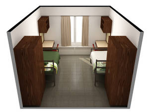 - Two double rooms share a common foyer with shower and toilet facilities (foyer cleaned every other week by custodial staff)