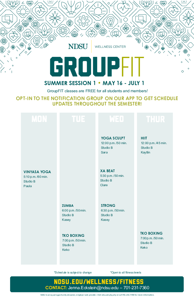 | Yoga | 6: 30 p.m. | Studio B | Mackenzie | 50 minutes |