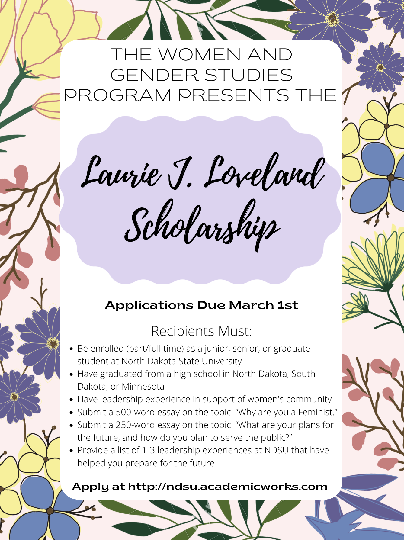 In addition to her professional accomplishments, Laurie Loveland was an advocate for women's rights, for adult literacy, and a friend and champion of children. She influenced co-workers, friends and family to make the world a better place. One of a truckdriver's seven children, Laurie was an academic star at Minot High School, NDSU and Yale Law School, but she remembered and honored her modest beginnings. This $5000 scholarship proposes to provide funding for North Dakota women who want to make a difference in the world as she did.