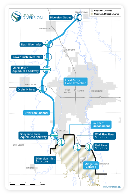 Following the devastation of the 1997 and 2008 – 2011 floods in the Red River Valley, there has been strong motivation and justification for a permanent structure to protect the nearly 260,000 people in the Fargo-Moorhead Metro Area. With federal and state support, construction on the Fargo-Moorhead Area Diversion Project (fmdiversion.gov) began in 2017. The project will provide a permanent solution to protect our communities and is expected to be completed in 2027.